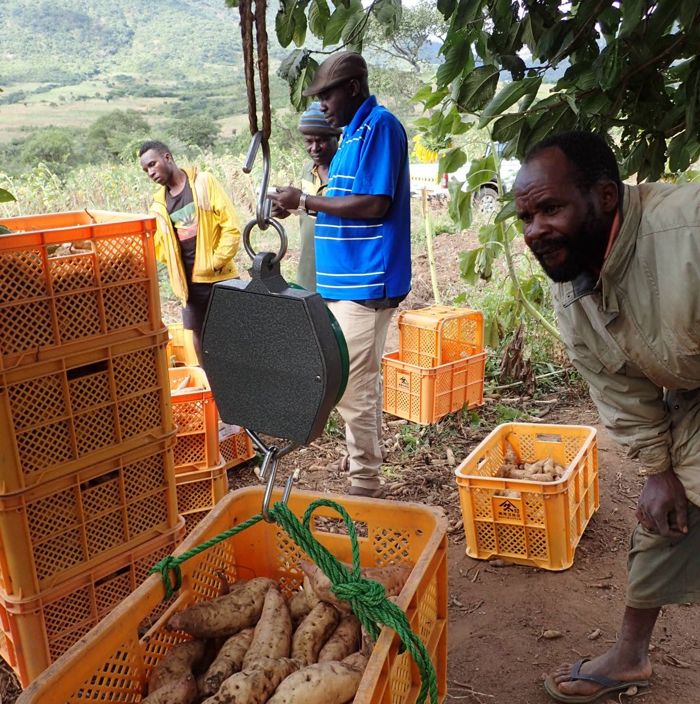 サツマイモを収穫したら、まず品質ごとに選別して重さを計り、価格を上乗せして買うことで、栽培を改善していくインセンティブにしてもらっています。